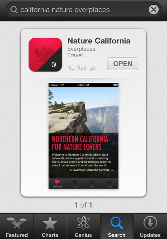 As you've probably guessed by now, the app is currently only available for Apple products. I'm hoping it'll be available on other platforms in the near future. If you're searching the App Store on your phone, just type in "California Nature Everplaces," and you'll get a screen that looks a little like this: